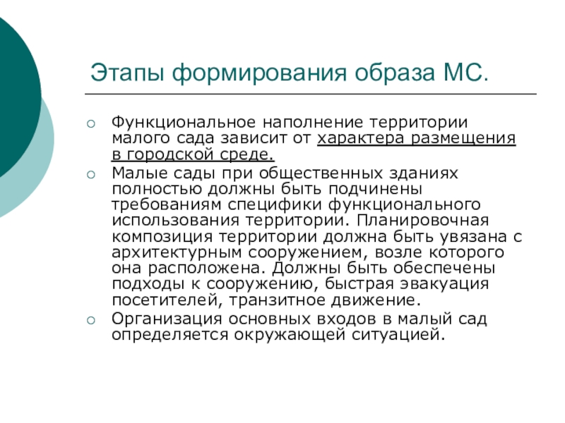 Малые сады при общественных зданиях полностью должны быть подчинены требованиям специфики функционального использования территории. Планировочная композиция территории должна быть увязана с архитектурным сооружением, возле которого она расположена. Должны быть обеспечены подходы к сооружению, быстрая эвакуация посетителей, транзитное движение.