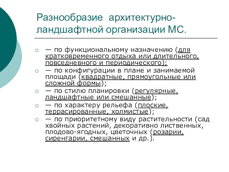 Слайд 4Разнообразие архитектурно-ландшафтной организации МС.
