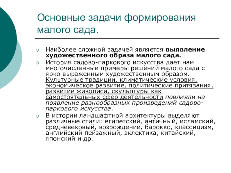 История садово-паркового искусства дает нам многочисленные примеры решений малого сада с ярко выраженным художественным образом. Культурные традиции, климатические условия, экономическое развитие, политические притязания, развитие живописи, скульптуры как самостоятельных сфер деятельности повлияли на появление разнообразных произведений садово-паркового искусства.
