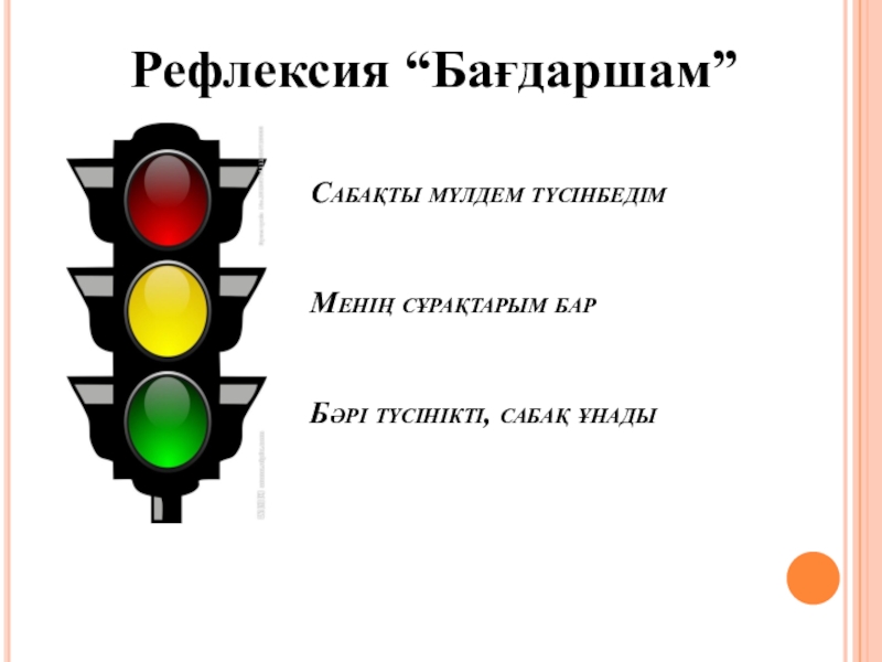 Сабақты мүлдем түсінбедім  Менің сұрақтарым бар  Бәрі түсінікті, сабақ ұнады Рефлексия “Бағдаршам”