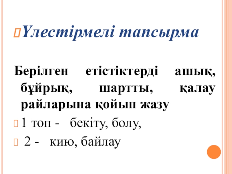 Үлестірмелі тапсырмаБерілген етістіктерді ашық, бұйрық, шартты, қалау райларына қойып жазу1 топ -  бекіту, болу, 2 -