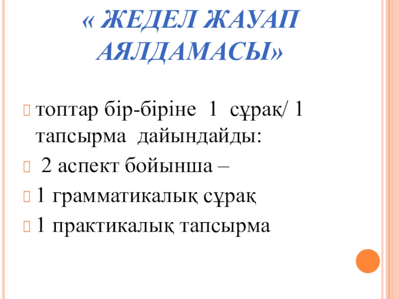« ЖЕДЕЛ ЖАУАП АЯЛДАМАСЫ» топтар бір-біріне 1 сұрақ/ 1 тапсырма дайындайды: 2 аспект бойынша – 1 грамматикалық