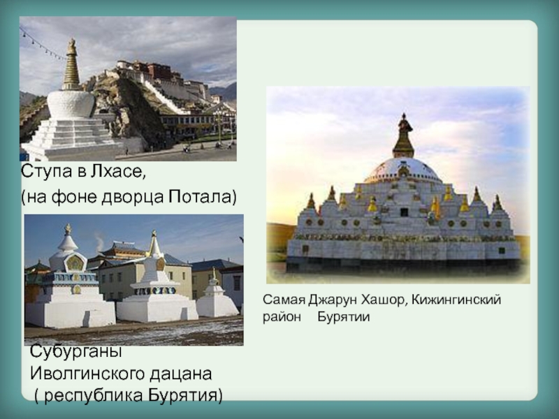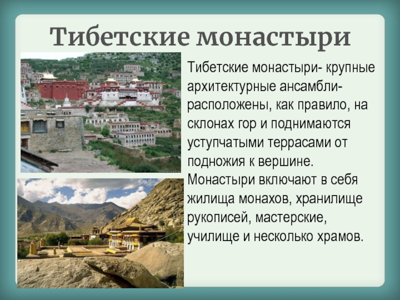 Тибетские монастыри- крупные архитектурные ансамбли- расположены, как правило, на склонах