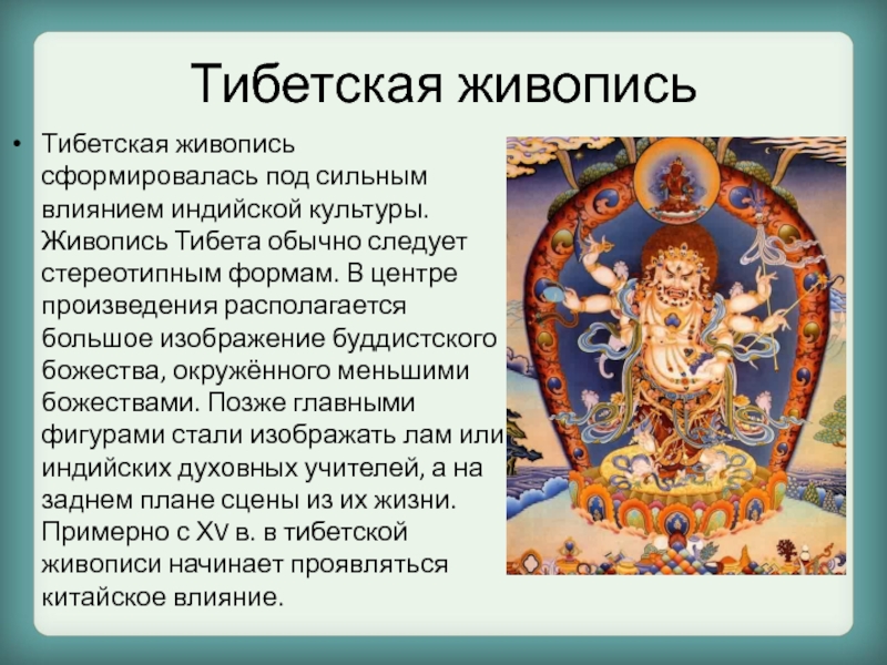 Тибетская живопись сформировалась под сильным влиянием индийской культуры.
