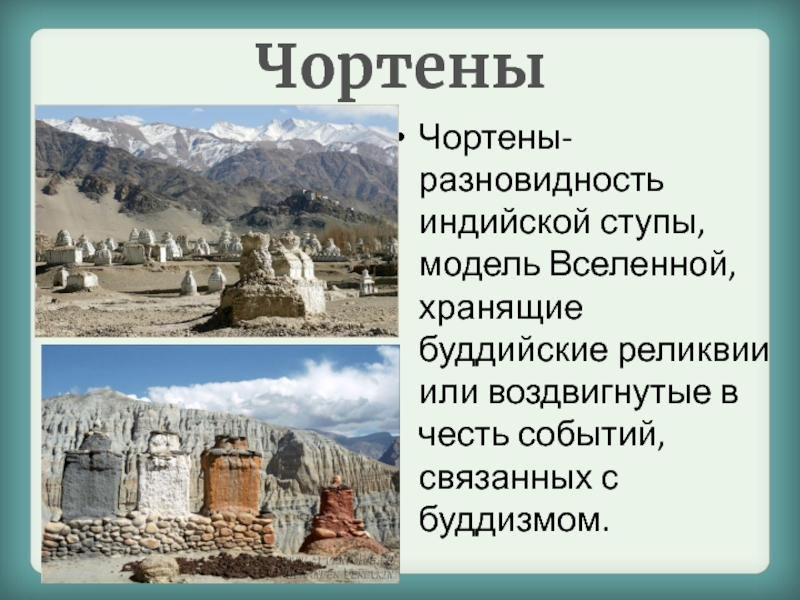 Чортены- разновидность индийской ступы, модель Вселенной, хранящие буддийские реликвии или