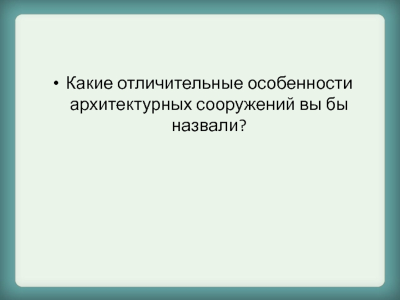 Слайд 9Какие отличительные особенности архитектурных сооружений вы бы назвали?