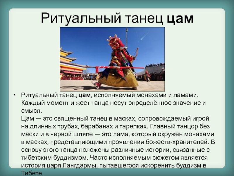 Цам — это священный танец в масках, сопровождаемый игрой на длинных трубах, барабанах и тарелках. Главный танцор без маски и в чёрной шляпе — это лама, который окружён монахами в масках, представляющими проявления божеств-хранителей. В основу этого танца положены различные истории, связанные с тибетским буддизмом. Часто исполняемым сюжетом является история царя Лангдармы, пытавшегося искоренить буддизм в Тибете.