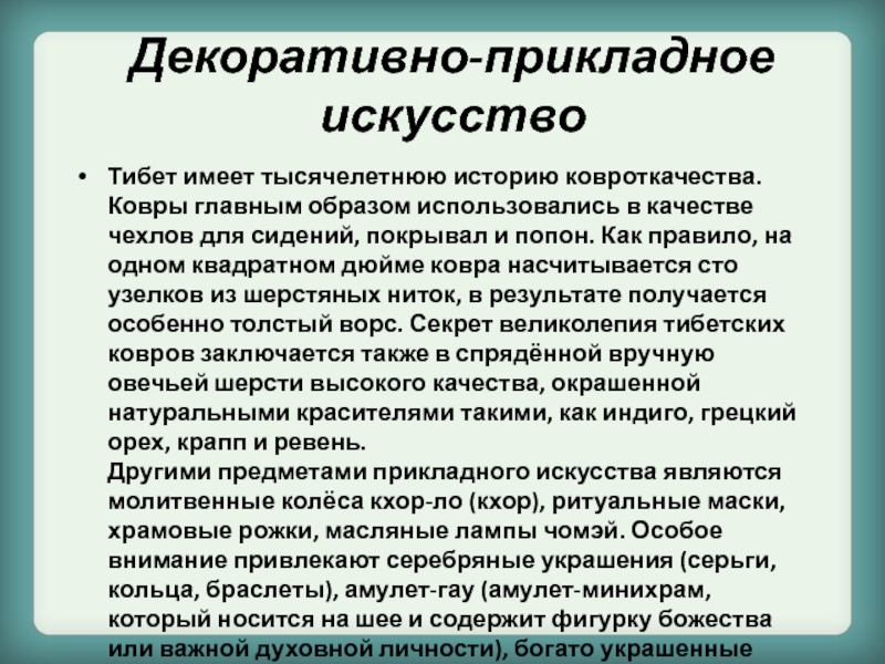 Тибет имеет тысячелетнюю историю ковроткачества. Ковры главным образом использовались в
