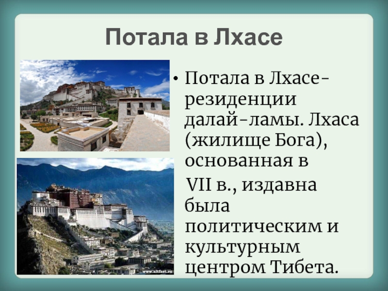 Потала в Лхасе- резиденции далай-ламы. Лхаса(жилище Бога), основанная в