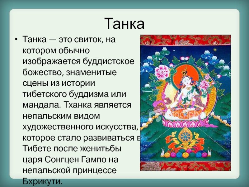 сцены из истории тибетского буддизма или мандала. Тханка является непальским видом художественного искусства, которое стало развиваться в Тибете после женитьбы царя Сонгцен Гампо на непальской принцессе Бхрикути.