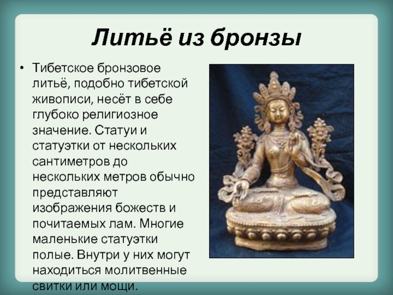 глубоко религиозное значение. Статуи и статуэтки от нескольких сантиметров до нескольких метров обычно представляют изображения божеств и почитаемых лам. Многие маленькие статуэтки полые. Внутри у них могут находиться молитвенные свитки или мощи.