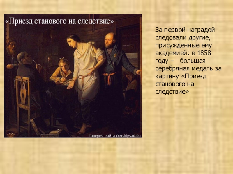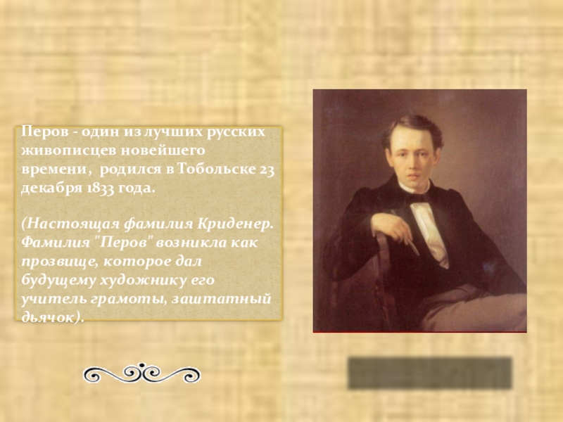 (Отец Григорий Карлович Криденер.) Фамилия "Перов" возникла как прозвище, которое дал будущему художнику его учитель грамоты, заштатный дьячок).