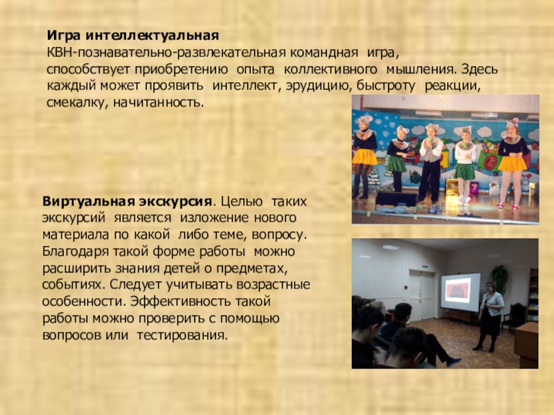 Виртуальная экскурсия. Целью таких экскурсий является изложение нового материала по какой либо теме, вопросу. Благодаря такой форме работы можно расширить знания детей о предметах, событиях. Следует учитывать возрастные особенности. Эффективность такой работы можно проверить с помощью вопросов или тестирования.