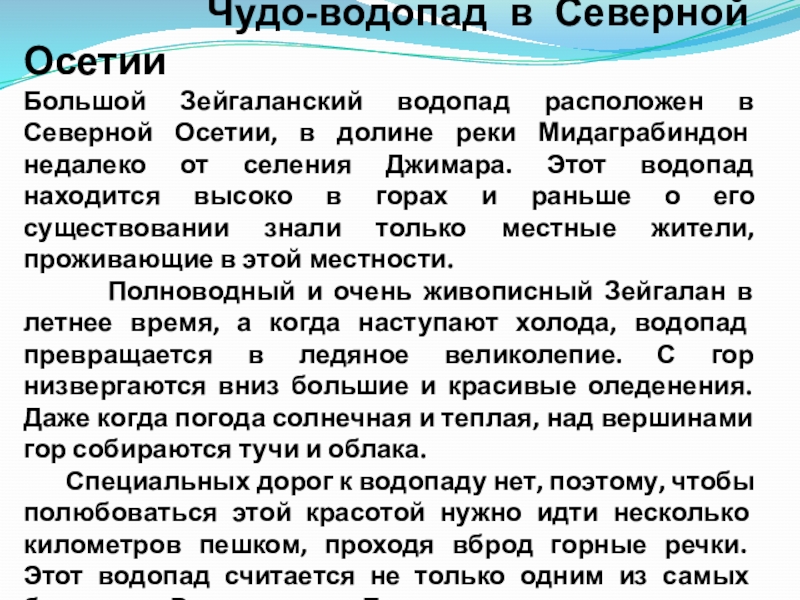 Полноводный и очень живописный Зейгалан в летнее время, а когда наступают холода, водопад превращается в ледяное великолепие. С гор низвергаются вниз большие и красивые оледенения. Даже когда погода солнечная и теплая, над вершинами гор собираются тучи и облака.