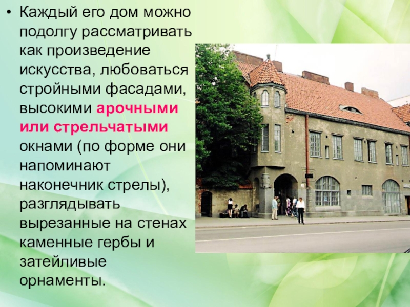 фасадами, высокими арочными или стрельчатыми окнами (по форме они напоминают наконечник стрелы), разглядывать вырезанные на стенах каменные гербы и затейливые орнаменты.