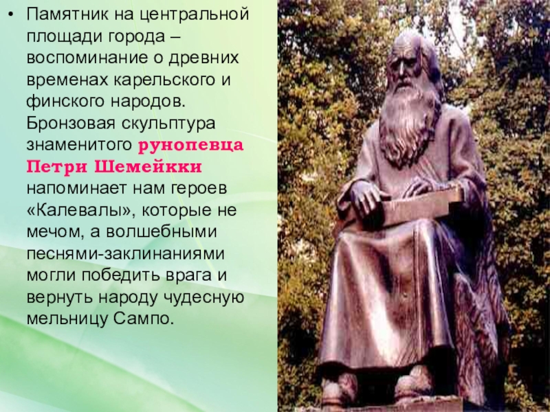 и финского народов. Бронзовая скульптура знаменитого рунопевца Петри Шемейкки напоминает нам героев «Калевалы», которые не мечом, а волшебными песнями-заклинаниями могли победить врага и вернуть народу чудесную мельницу Сампо.