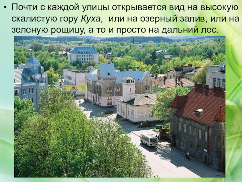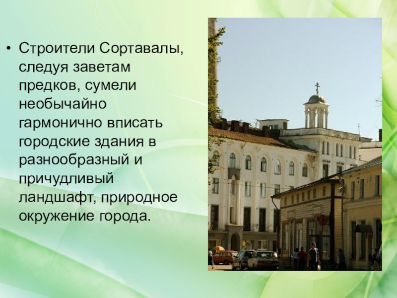 Слайд 17Строители Сортавалы, следуя заветам предков, сумели необычайно гармонично вписать городские здания