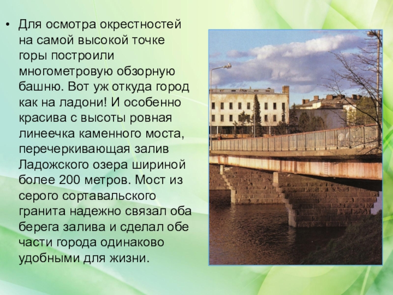 башню. Вот уж откуда город как на ладони! И особенно красива с высоты ровная линеечка каменного моста, перечеркивающая залив Ладожского озера шириной более 200 метров. Мост из серого сортавальского гранита надежно связал оба берега залива и сделал обе части города одинаково удобными для жизни.
