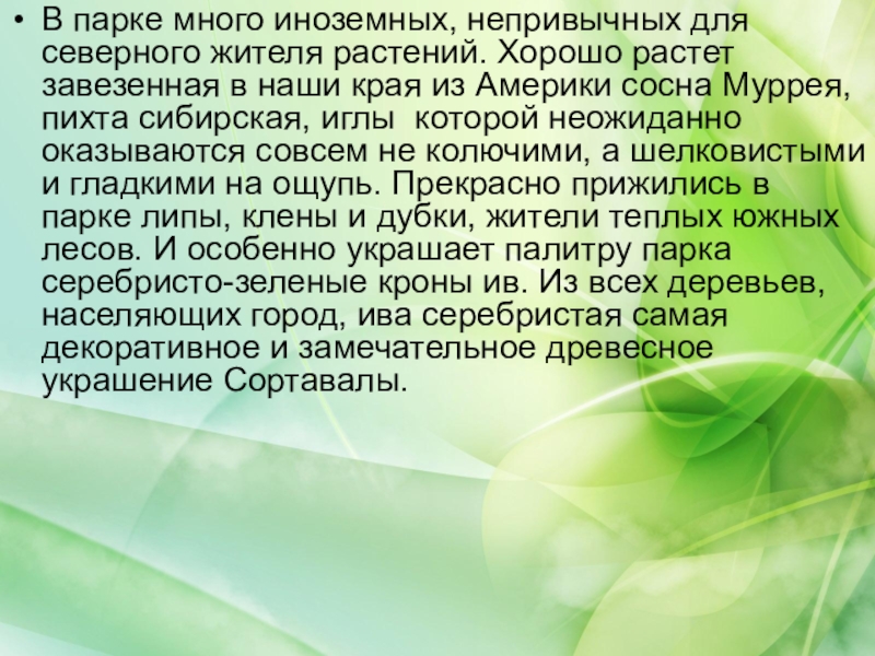 завезенная в наши края из Америки сосна Муррея, пихта сибирская, иглы которой неожиданно оказываются совсем не колючими, а шелковистыми и гладкими на ощупь. Прекрасно прижились в парке липы, клены и дубки, жители теплых южных лесов. И особенно украшает палитру парка серебристо-зеленые кроны ив. Из всех деревьев, населяющих город, ива серебристая самая декоративное и замечательное древесное украшение Сортавалы.