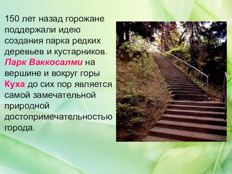 кустарников. Парк Ваккосалми на вершине и вокруг горы Куха до сих пор является самой замечательной природной достопримечательностью города.