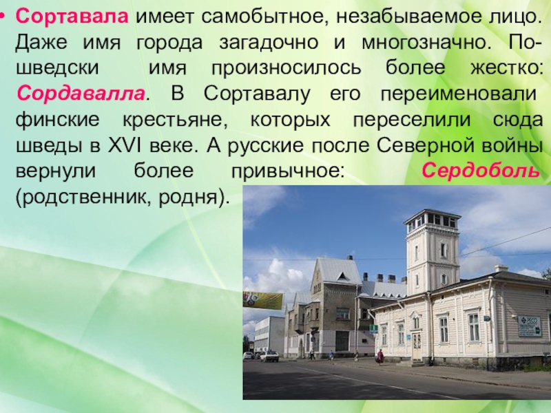 Слайд 5Сортавала имеет самобытное, незабываемое лицо. Даже имя города загадочно и многозначно.