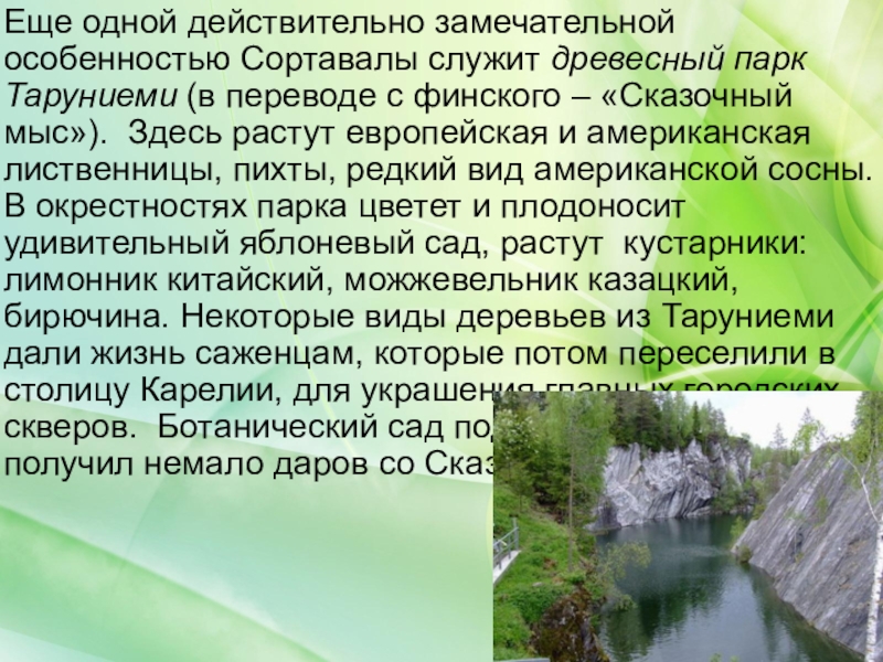 переводе с финского – «Сказочный мыс»). Здесь растут европейская и американская лиственницы, пихты, редкий вид американской сосны. В окрестностях парка цветет и плодоносит удивительный яблоневый сад, растут кустарники: лимонник китайский, можжевельник казацкий, бирючина. Некоторые виды деревьев из Таруниеми дали жизнь саженцам, которые потом переселили в столицу Карелии, для украшения главных городских скверов. Ботанический сад под Петрозаводском тоже получил немало даров со Сказочного мыса.