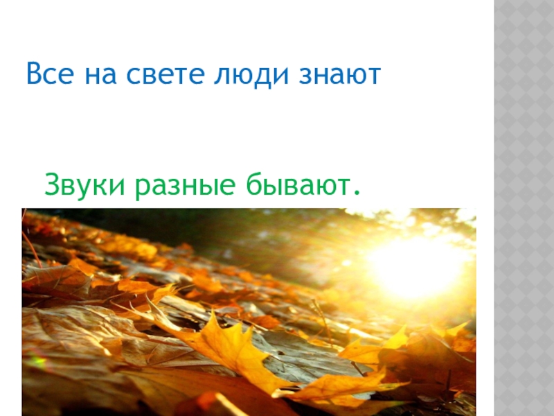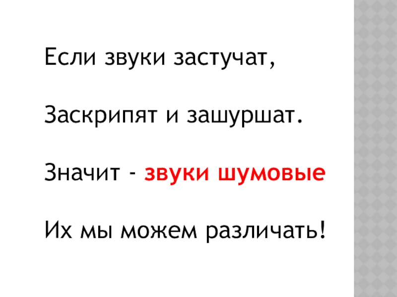 Если звуки застучат,Заскрипят и зашуршат.Значит - звуки шумовыеИх мы можем различать!