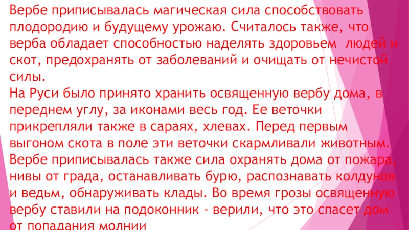 Слайд 7Вербе приписывалась магическая сила способствовать плодородию и будущему урожаю. Считалось также,