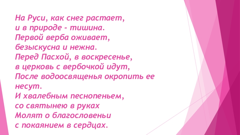 и нежна. Перед Пасхой, в воскресенье, в церковь с вербочкой идут, После водоосвященья окропить ее несут. И хвалебным песнопеньем, со святынею в руках Молят о благословеньи с покаянием в сердцах.