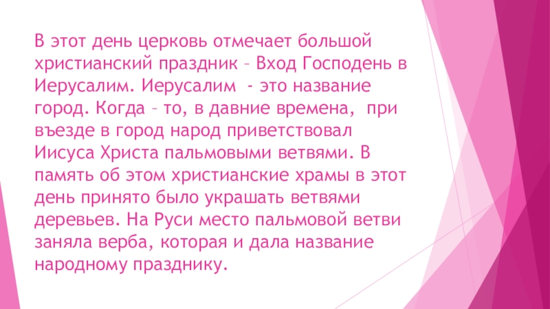 в Иерусалим. Иерусалим  - это название город. Когда – то, в давние времена,  при въезде в город народ приветствовал Иисуса Христа пальмовыми ветвями. В память об этом христианские храмы в этот день принято было украшать ветвями деревьев. На Руси место пальмовой ветви заняла верба, которая и дала название народному празднику.