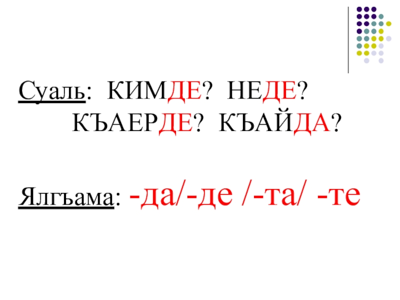 Суаль: КИМДЕ? НЕДЕ?		 КЪАЕРДЕ? КЪАЙДА?Ялгъама: -да/-де /-та/ -те