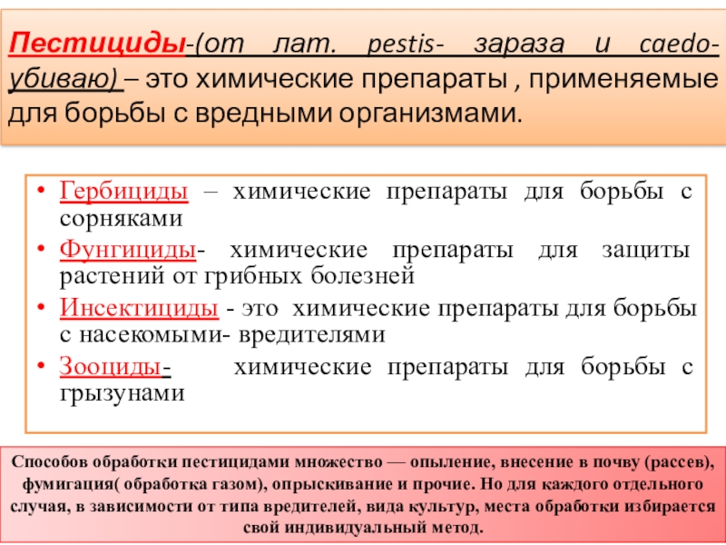Способов обработки пестицидами множество — опыление, внесение в почву (рассев), фумигация( обработка газом), опрыскивание и прочие. Но для каждого отдельного случая, в зависимости от типа вредителей, вида культур, места обработки избирается свой индивидуальный метод.