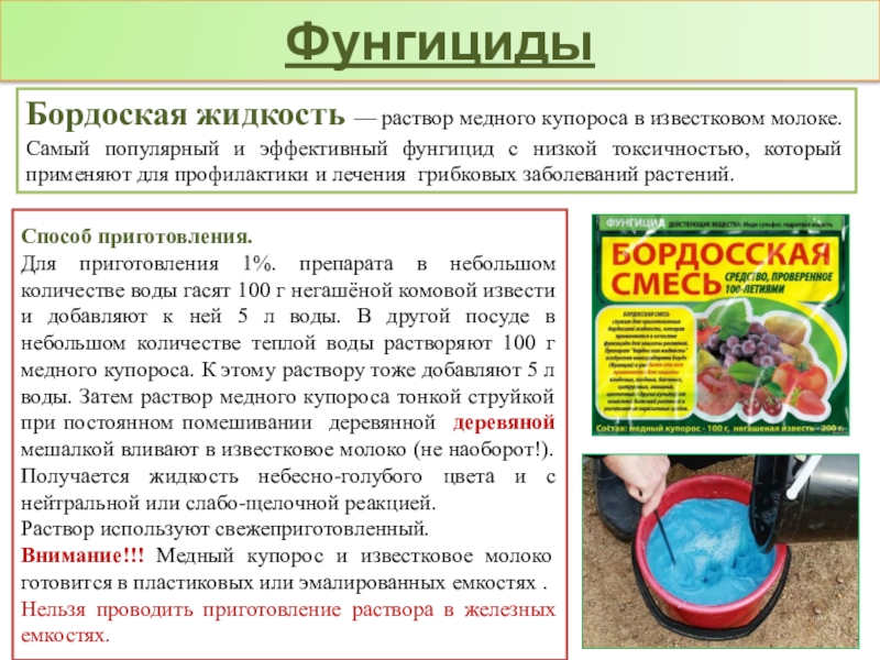 Для приготовления 1%. препарата в небольшом количестве воды гасят 100 г негашёной комовой извести и добавляют к ней 5 л воды. В другой посуде в небольшом количестве теплой воды растворяют 100 г медного купороса. К этому раствору тоже добавляют 5 л воды. Затем раствор медного купороса тонкой струйкой при постоянном помешивании деревянной деревяной мешалкой вливают в известковое молоко (не наоборот!). Получается жидкость небесно-голубого цвета и с нейтральной или слабо-щелочной реакцией.