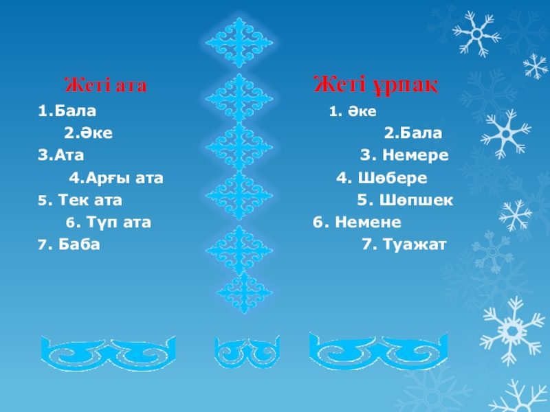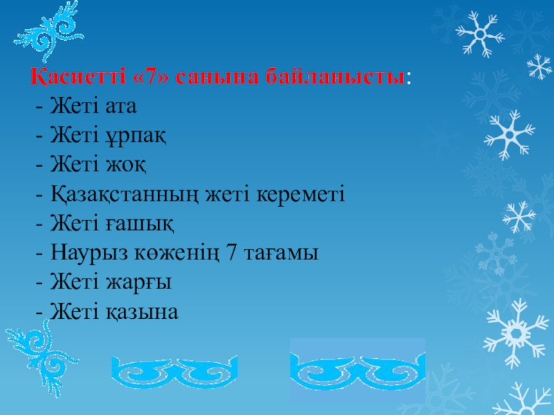 Слайд 4Қасиетті «7» санына байланысты: - Жеті ата - Жеті ұрпақ -