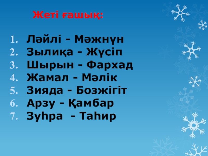 Жеті ғашық:Ләйлі - Мәжнүн         Зылиқа -