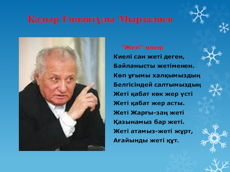 Қадыр Ғинаятұлы Мырзалиев   “Жеті” өлеңіКиелі сан жеті деген,Байланысты жетіменен.Көп ұғымы халқымыздыңБелгісіндей салтымыздыңЖеті қабат көк жер