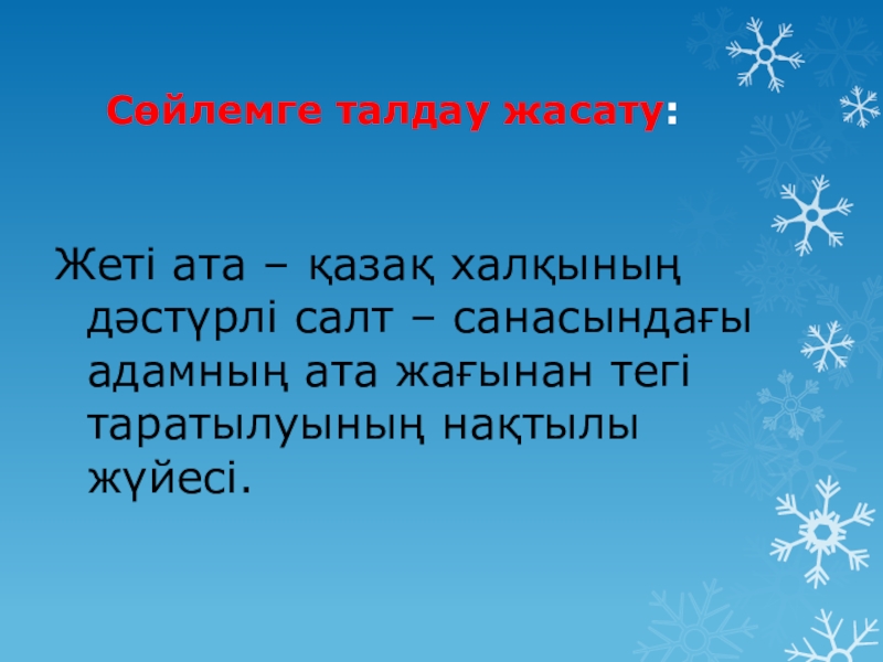 Сөйлемге талдау жасату:Жеті ата – қазақ халқының дәстүрлі салт – санасындағы адамның ата жағынан тегі таратылуының нақтылы