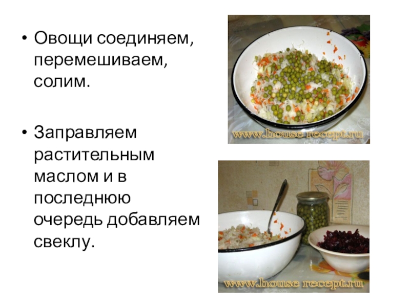 Слайд 4Овощи соединяем, перемешиваем, солим.