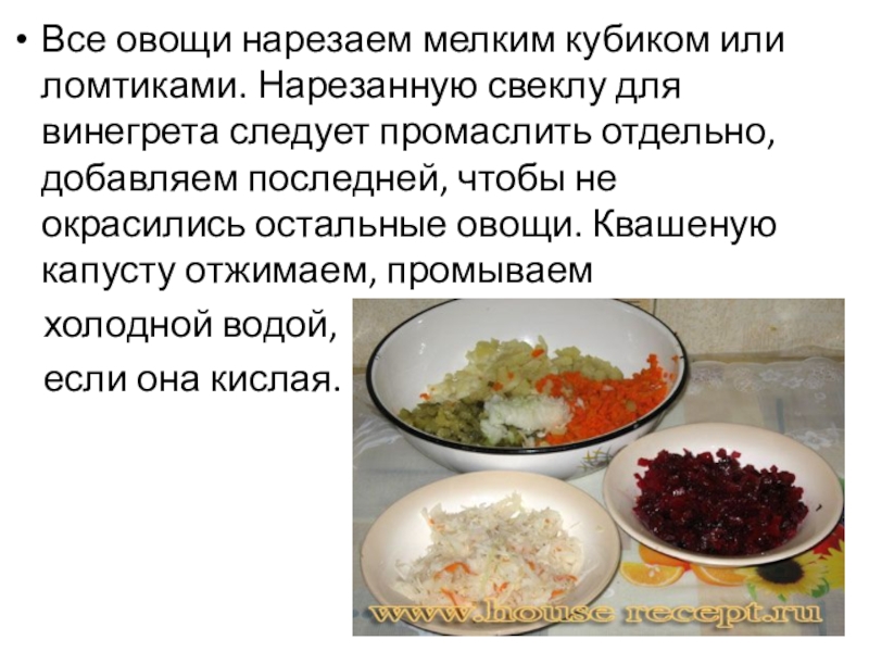 Слайд 3Все овощи нарезаем мелким кубиком или ломтиками. Нарезанную свеклу для винегрета