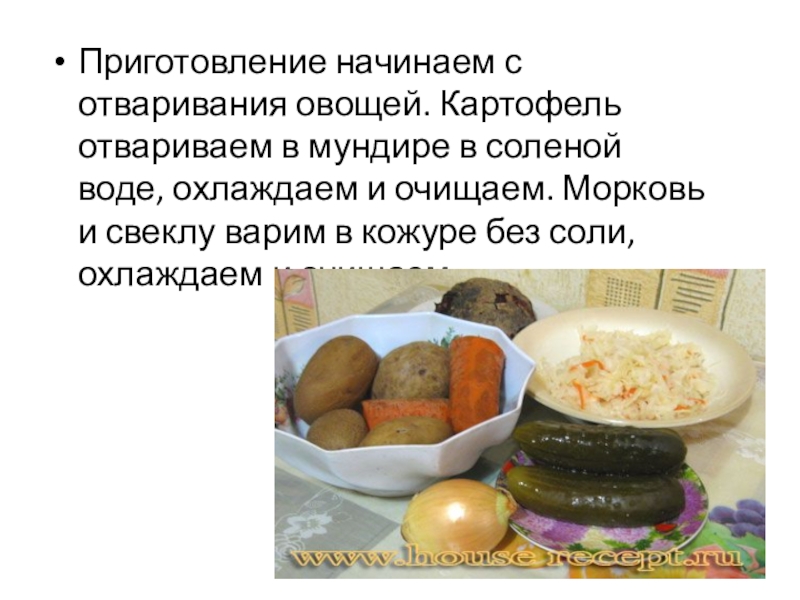Слайд 2Приготовление начинаем с отваривания овощей. Картофель отвариваем в мундире в соленой