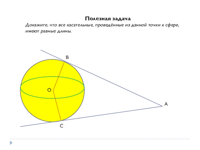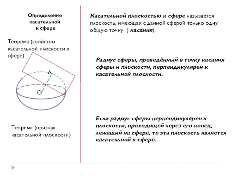 Если радиус сферы перпендикулярен к плоскости, проходящей через его конец, лежащий на сфере, то эта плоскость является касательной к сфере.