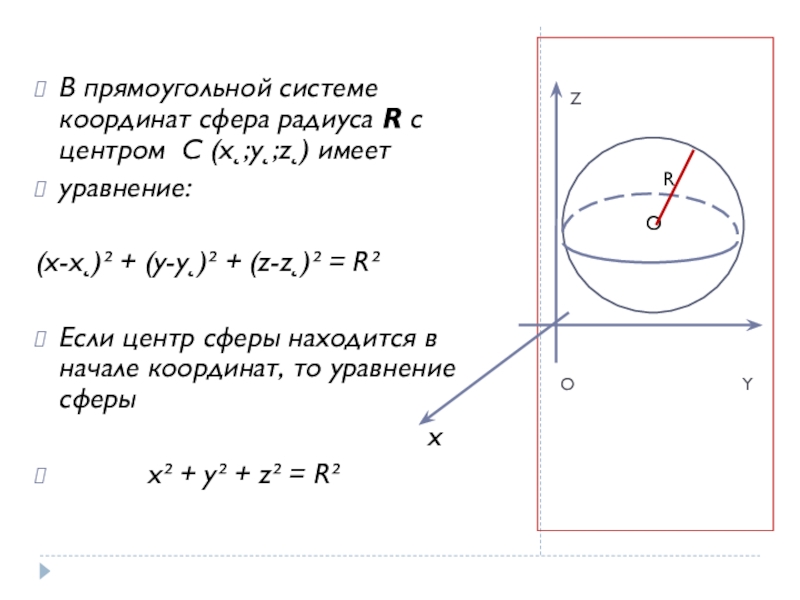 В прямоугольной системе координат сфера радиуса R с центром C (x˛;y˛;z˛) имеет