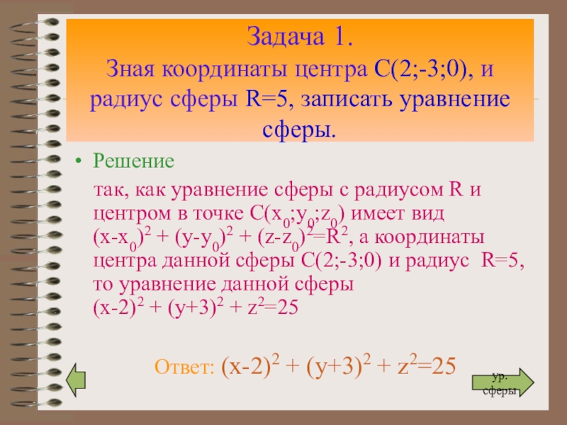 Ответ: (x-2)2 + (y+3)2 + z2=25