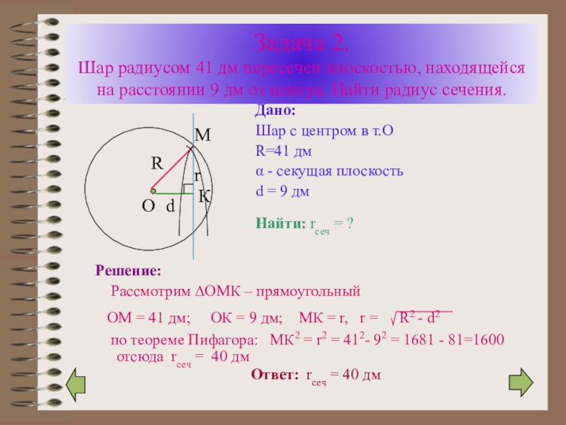 по теореме Пифагора: МК2 = r2 = 412- 92 = 1681 - 81=1600 отсюда rсеч = 40 дм