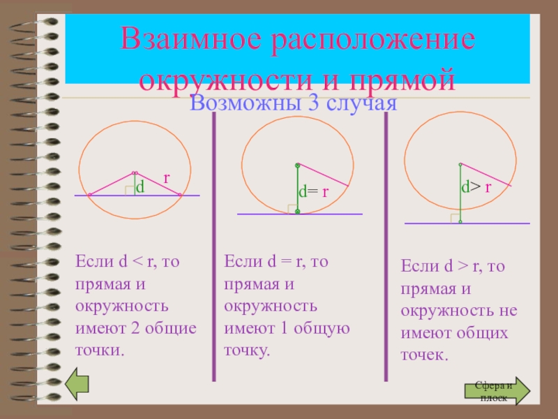 d < R, т.е. если расстояние от центра сферы до плоскости меньше радиуса сферы, то сечение сферы плоскостью есть окружность радиусом r.