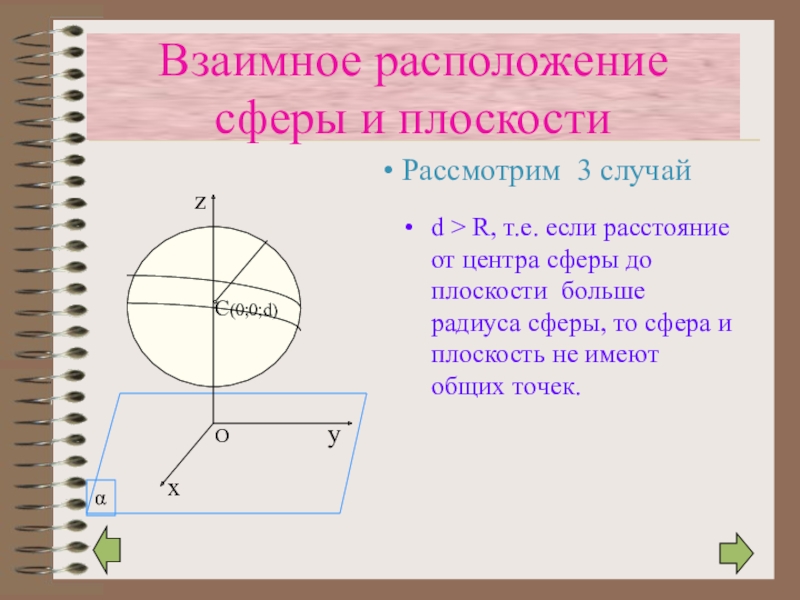 Изобразим сферу с центром в т.С, лежащей на положительной полуоси Oz и имеющей координаты (0;0;d), где d - расстояние (перпендикуляр) от центра сферы до плоскости α .