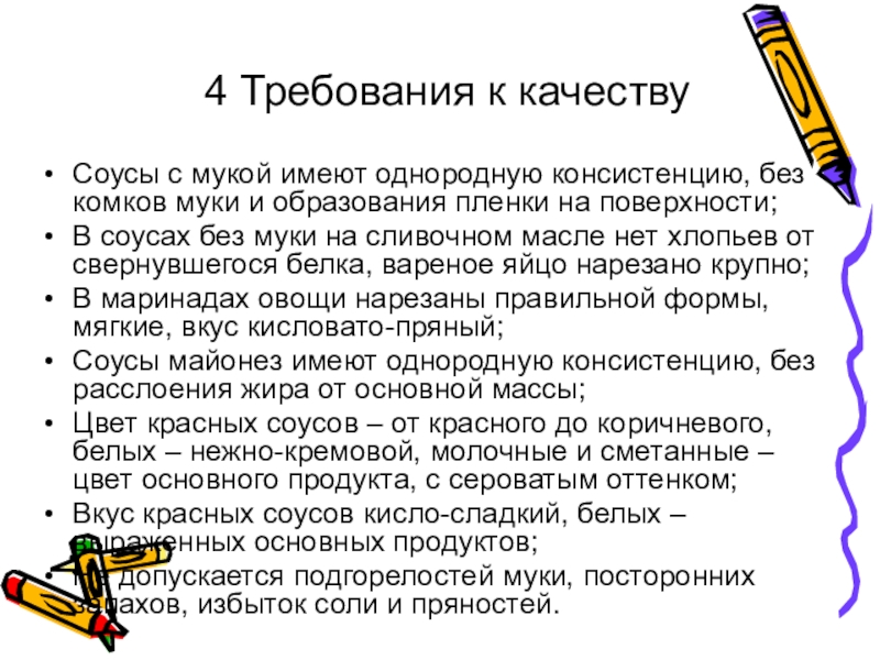 Не допускается подгорелостей муки, посторонних запахов, избыток соли и пряностей.