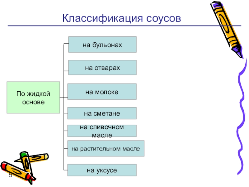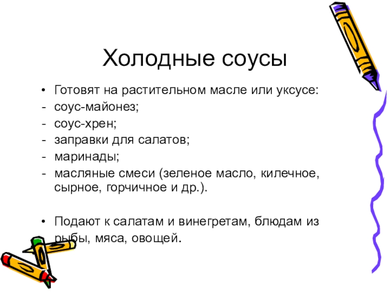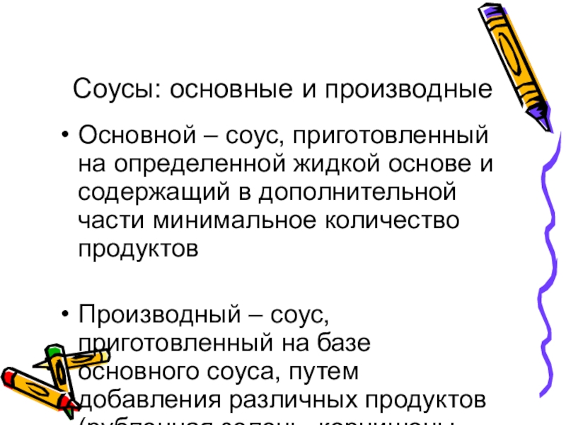 Производный – соус, приготовленный на базе основного соуса, путем добавления различных продуктов (рубленная зелень, корнишоны, грибы и др.)