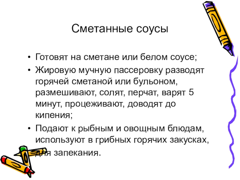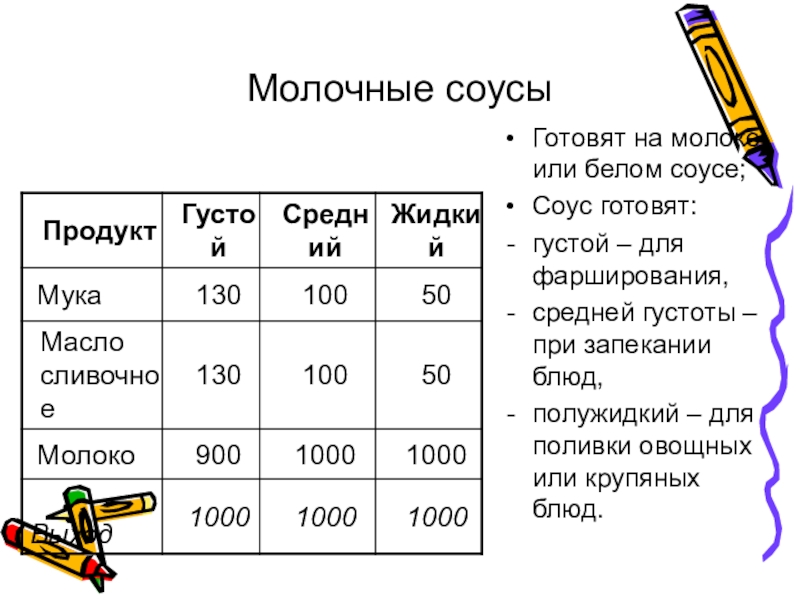Цвет красных соусов – от красного до коричневого, белых – нежно-кремовой, молочные и сметанные – цвет основного продукта, с сероватым оттенком;