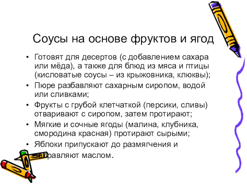 или мёда), а также для блюд из мяса и птицы (кисловатые соусы – из крыжовника, клюквы);